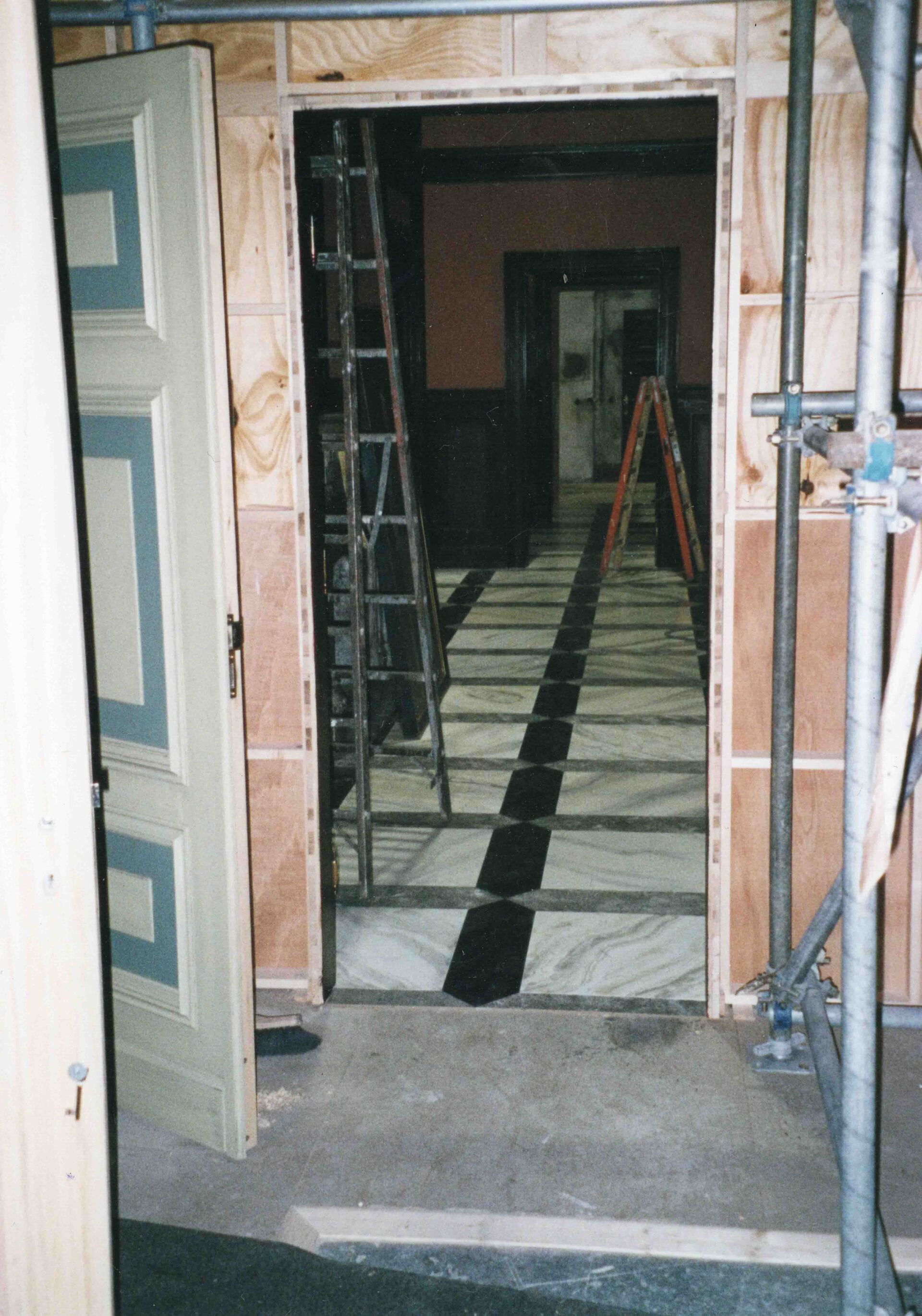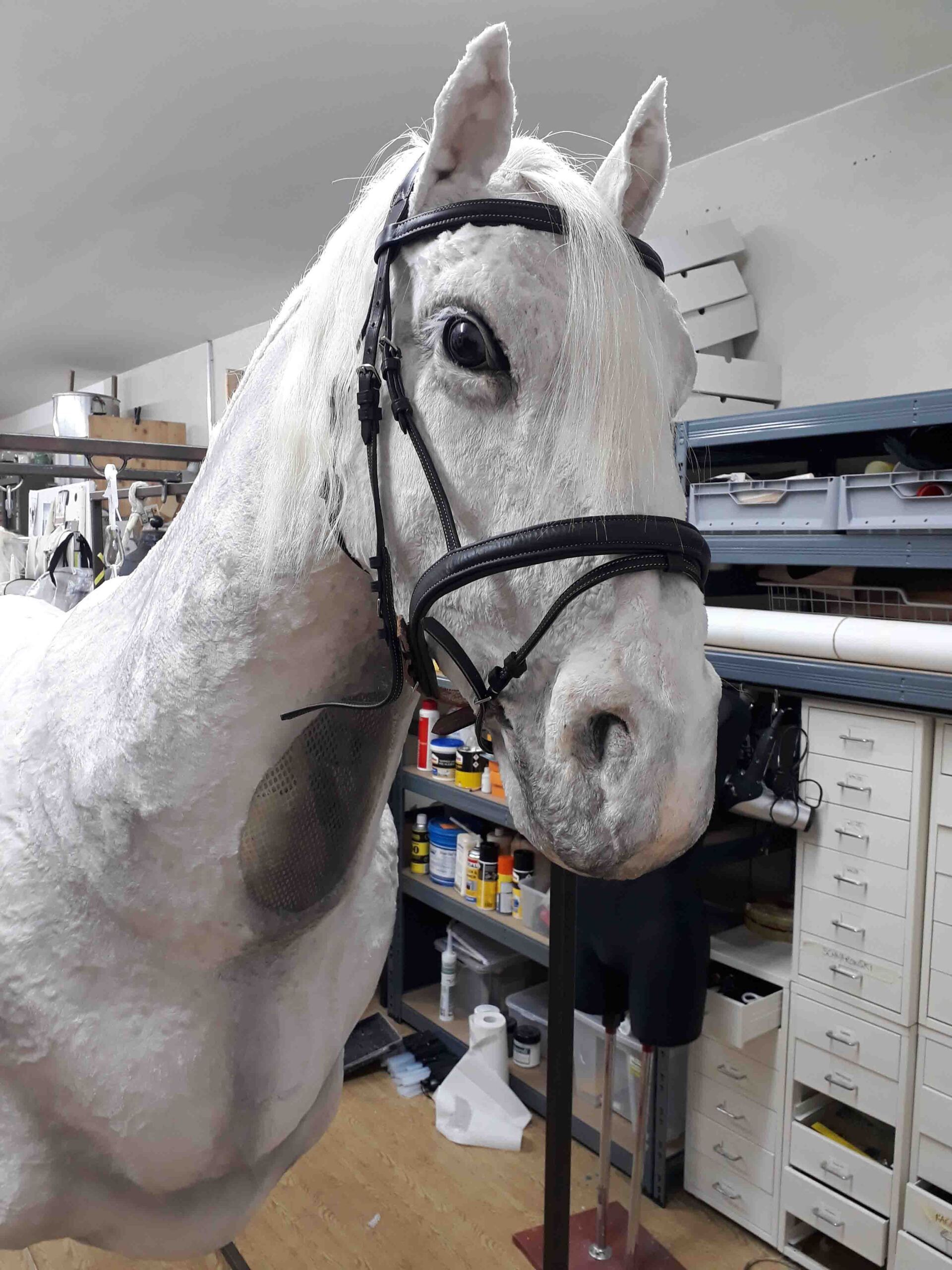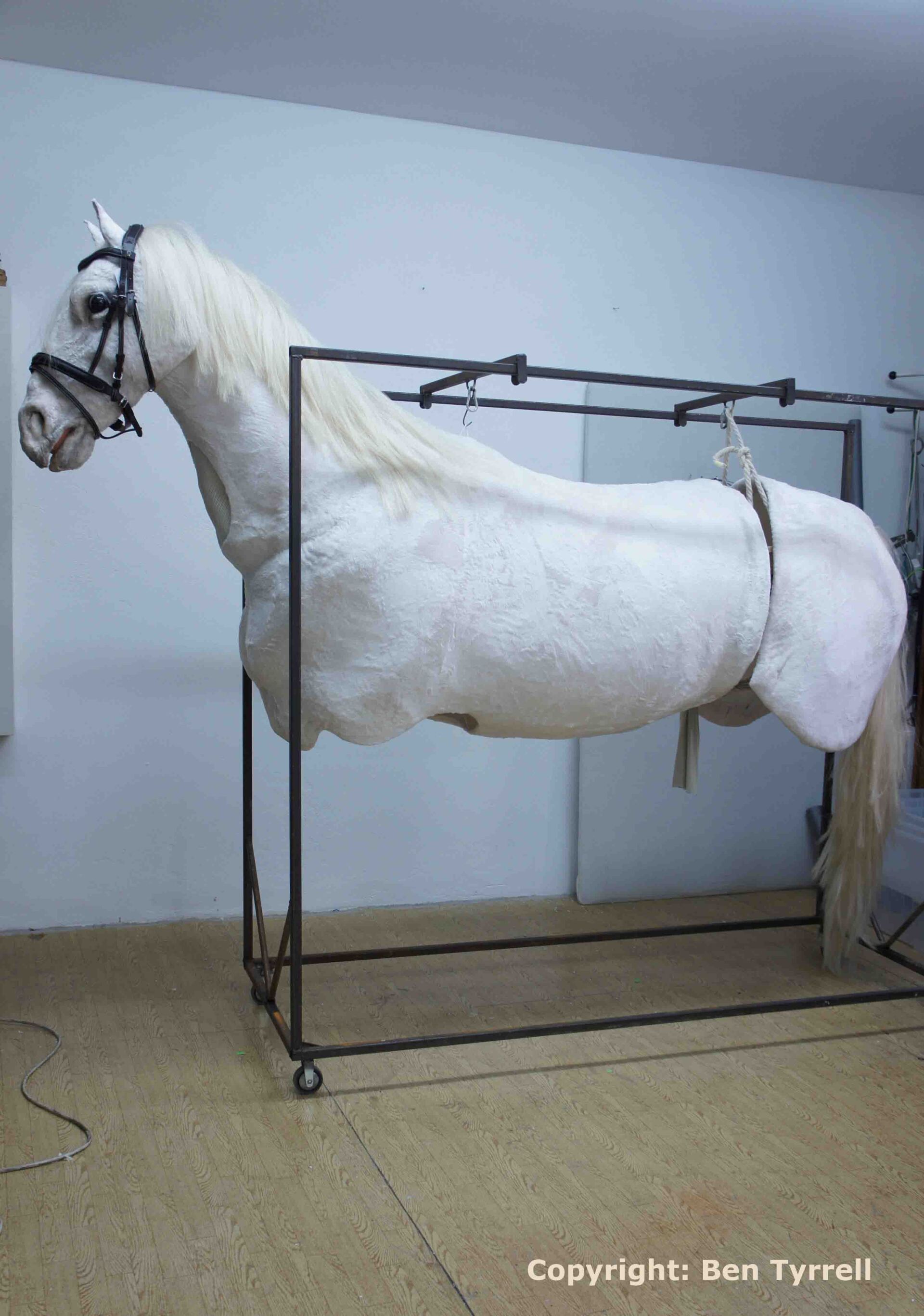 The internal structure for the horse was built out of wood and wire. The outer shell was modeled with Varaform and covered with an artificial fur. It was worn by two actors who also provided the horses legs, and had to support an opera singer riding it.
