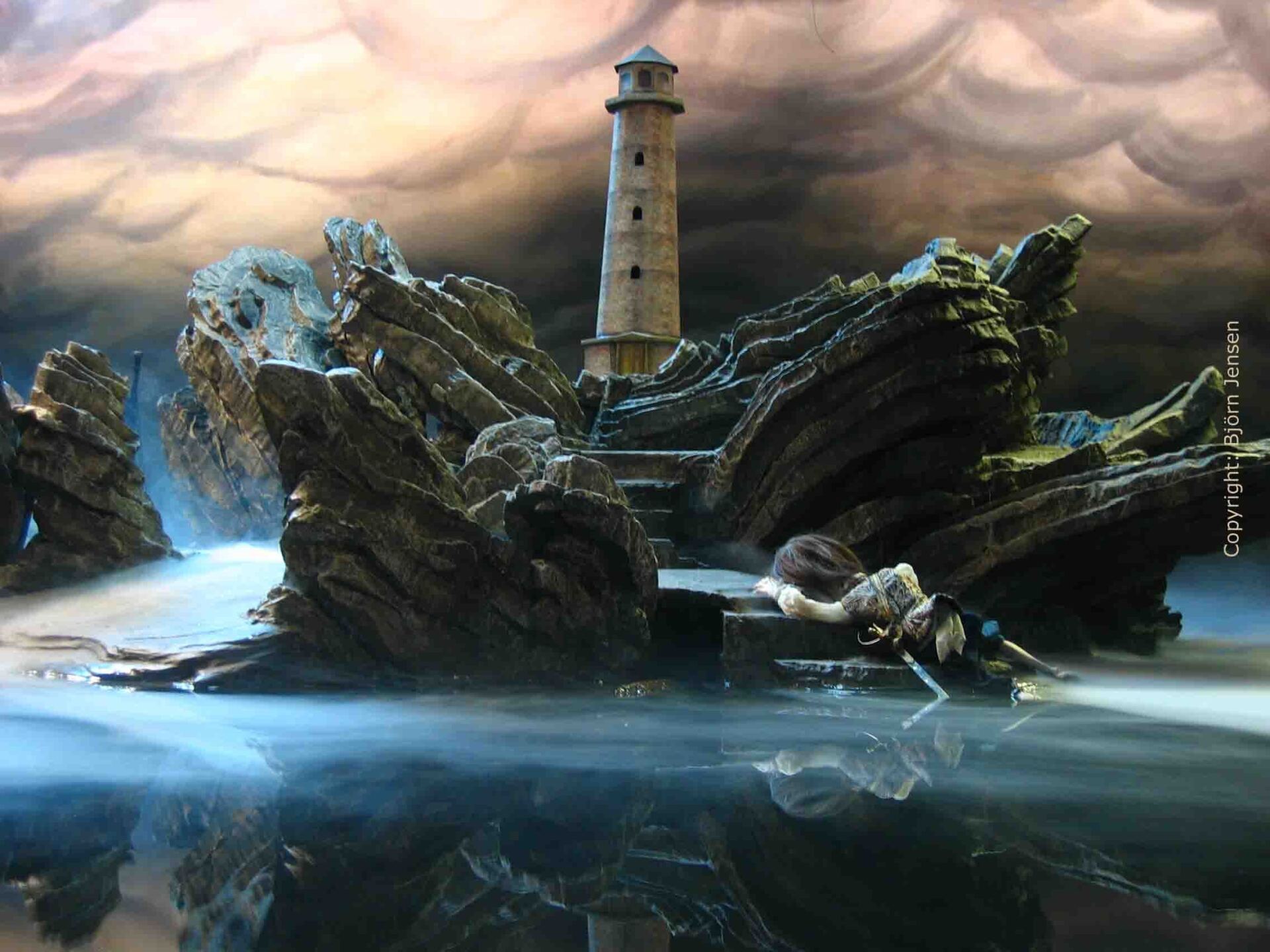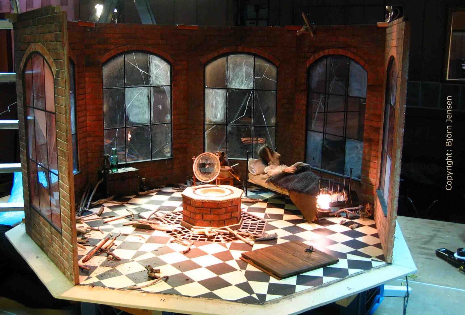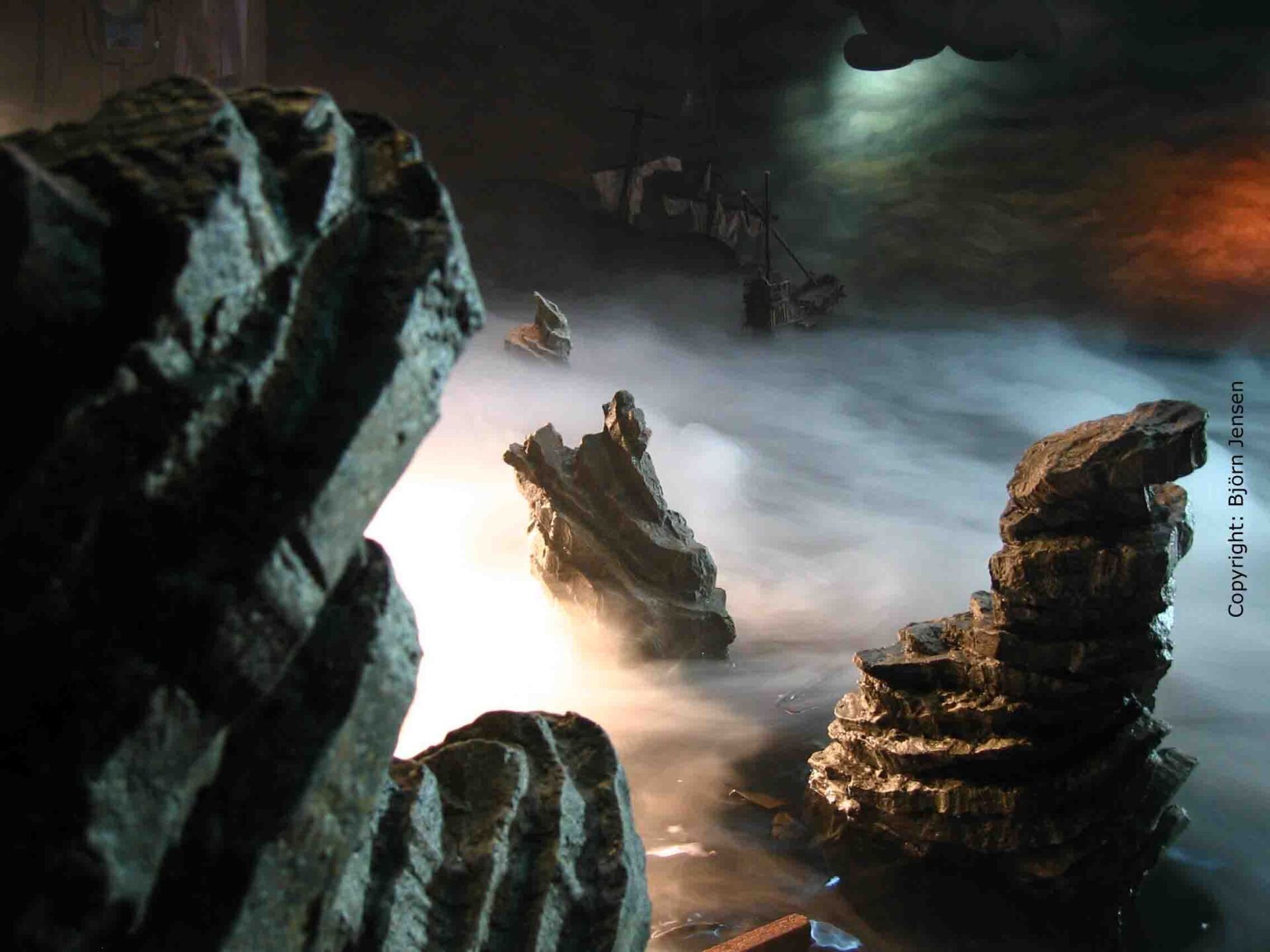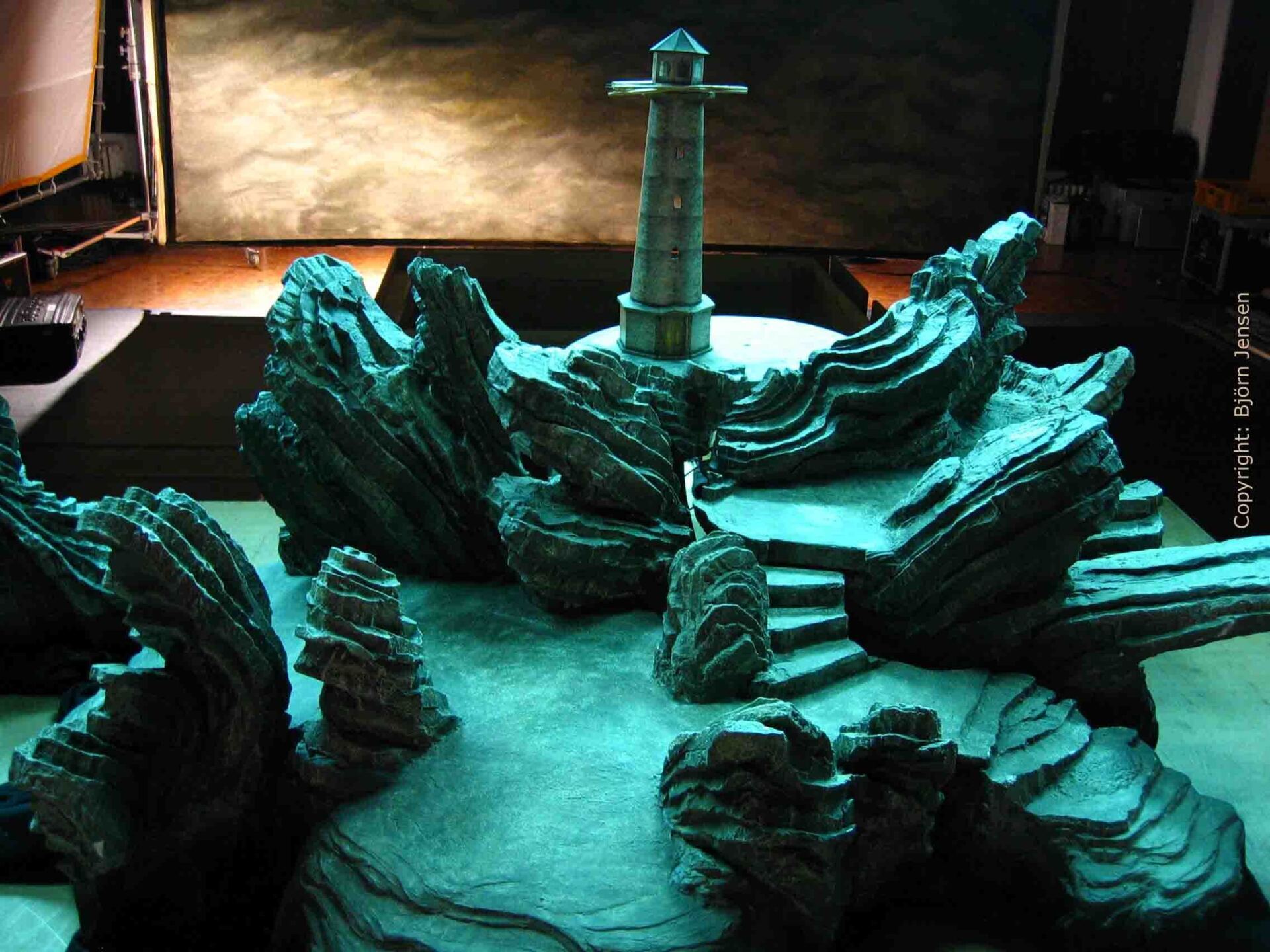 The marionette film is based on the short story "The Jinn" by Franz Werfel. I was responsible for building the lighthouse and the island, which had to stand in a large basin of water. The cliffs are inspired by rock formations on the Welsh coast.